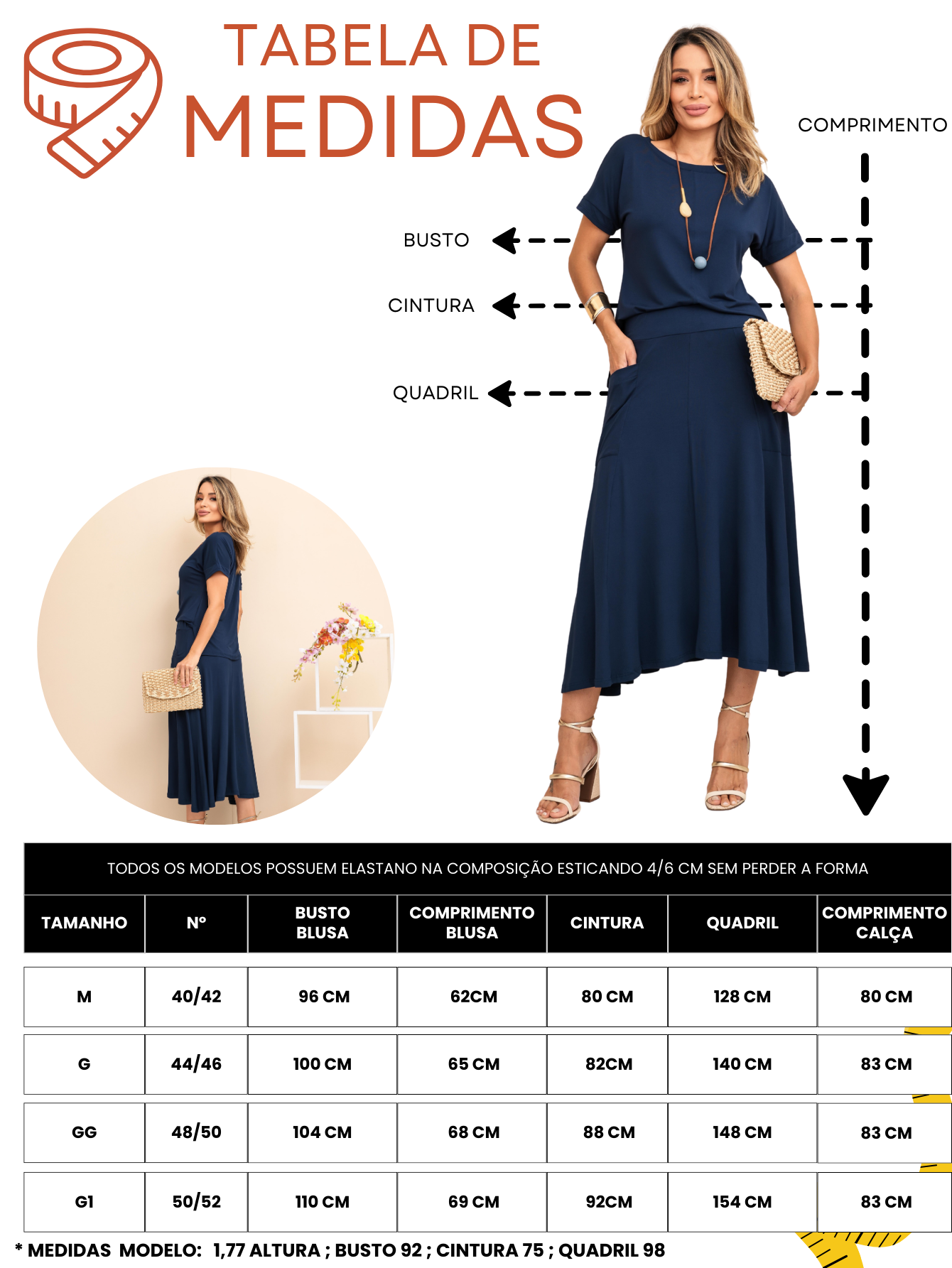 Exale sofisticação com este conjunto feminino, perfeito para mulheres que buscam estilo, conforto e praticidade em uma única peça. Composto por uma blusa demanga curta com caimento leve e uma saia midi fluida com bolsos discretos, o conjunto proporciona uma silhueta alongada e elegante, ideal para diversas ocasiões — do trabalho ao happy hour.